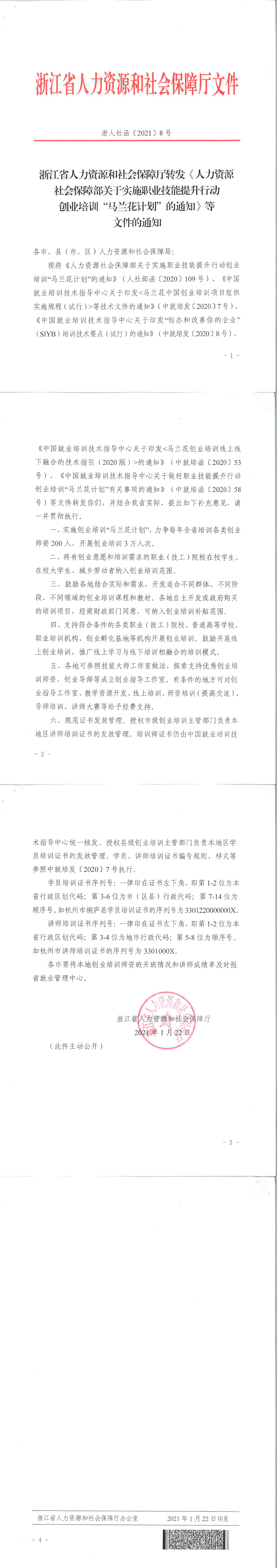 浙江省人力资源和社会保障厅转发《人力资源社会保障部关于实施职业技能提升行动创业培训“马兰花计划”的通知》等文件的通知 浙人社函〔2021〕8号